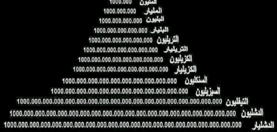 10. ديسيليون (أو ديسيلليون): 1,000,000,000,000,000,000,000,000,000,000,000 (واحد وعشرون صفراً)